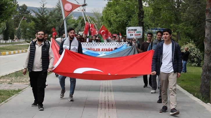 Sivas Filistin Dayanışma İnisiyatifi tarafından düzenlenen etkinlikte, Cumhuriyet Üniversitesi Tıp Fakültesi Araştırma ve Uygulama Hastanesi önünde toplanan öğrenciler ve hastane çalışanları, Türk ve Filistin bayraklarıyla merkez kafeterya önüne yürüdü.