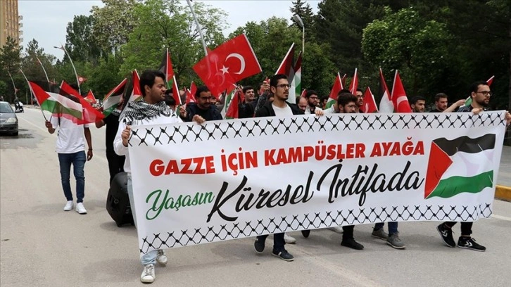 Sivas Filistin Dayanışma İnisiyatifi tarafından düzenlenen etkinlikte, Cumhuriyet Üniversitesi Sağlık Hizmetleri Araştırma ve Uygulama Hastanesi önünde toplanan öğrenciler ve bazı hastane çalışanları, Türk ve Filistin bayraklarıyla merkezi kafeterya önüne kadar yürüdü.