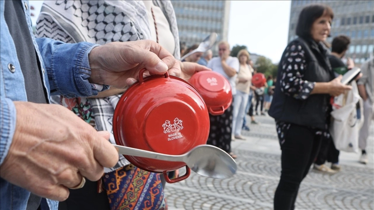 Başkentteki Cumhuriyet Meydanı'nda toplananlar, "Gazze aç, hükümet ne yapıyor", "Slovenya, Gazze'deki soykırımı durdurmak için harekete geç" yazılı dövizler taşıdı.