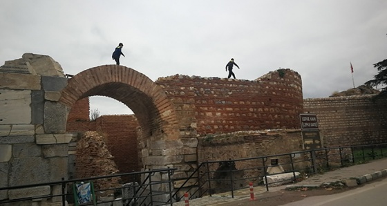 Canlarını hiçe sayan çocuklar, oyun alanı olarak seçtikleri 5 metre yükseklikteki İznik surlarına tırmanıp üzerinde koşuyorlar. Surların çevresinde ise ikaz levhası bulunmuyor. Tehlikeye aldırış etmeden oyun sandıkları yüksek surlarda koşan afacanlar için aileler tedirgin. Yetkililerden muhtemel bir kazaya karşı çocukların buralara çıkmasına engel olunmasını istiyorlar.