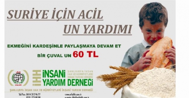 İHH İnsani Yardım Vakfı Şanlıurfa Temsilciliği tarafından aralıksız süren saldırılar yüzünden ekmeğin Türkiye parasıyla 17 liraya çıktığı Suriye’de ‘Acil Una İhtiyaç Var’ sloganıyla yardım kampanyası başlatıldı. Şanlıurfa İHH Şanlıurfa Temsilcisi Behçet Atila, Suriye’deki fırınlarda un stoklarının bitmek üzere olduğunu ifade ederek, “Suriye’de başta çocuklar olmak üzere kadın, yaşlı ve hastaların hayata tutunabilmeleri için temel gıdaların acil ulaştırılması şart. Suriye’de ekmek üretimi duracak seviyeye gelmiş durumda ve kardeşlerimiz için acil una ihyacımız var” dedi.
