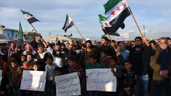 Suriye ayaklanmalarının sembolü "Suriye Devrim Bayrağı" taşıyan eylemciler, Barış Pınarı Harekatı'na destek veren Suriye Milli Ordusu'na (SMO) seslenerek, YPG/PKK terör örgütü işgalindeki Tel Rıfat, Minneğ ve Harbel yerleşimlerinin kurtarılmasını istedi.