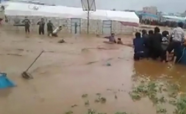 Suriye’deki Atme mülteci kampında yaşanan sel felaketinde bir çocuk boğulmaktan son anda kurtarıldı.
