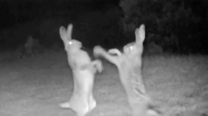 Fotokapanlardan birine, iki tavşanın arka ayakları üzerine kalkarak ön ayaklarıyla birbirine vurduğu anların görüntüsü yansıdı.