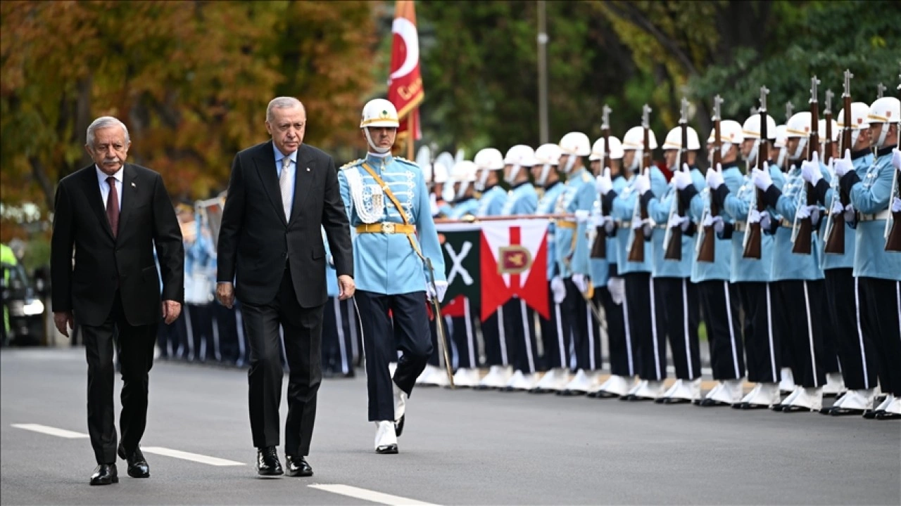 TBMM Başkanı Numan Kurtulmuş, Cumhurbaşkanlığı Onur Kıtası'nı selamlayan Cumhurbaşkanı Erdoğan'ı Şeref Kapısı önünde karşıladı.