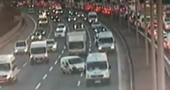 Güvenlik kameralarına yansıyan görüntülerde, hafif ticari araç ile minibüs birbirlerini sollamak istiyor. Ancak araç, minibüsün kendisini sollamasına izin vermiyor. Bunun üzerine minibüs aracı bariyerlere sıkıştırarak çarpıyor. Çarpmanın etkisiyle araç kontrolden çıkarak bariyerlere çarpıyor. Bariyerlere çarptıktan sonra araç seyir halinde olan bir kapalı kasa kamyonete çarpıyor. Minibüs şoförü ise hiçbir şey olmamış gibi yoluna devam ediyor.