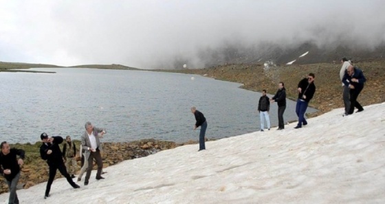 Erzincan’ın en yüksek dağı olan 3550 rakımlı Keşiş Dağları Esence mevkiindeki Yedigöller bölgesinde incelemelerde bulunan Erzincan Valisi Ali Arslantaş, Erzincan Milletvekili Sebahattin Karakelle ve beraberindeki protokol mensupları, 3010 metrede bulunan Yedigöller mevkiinde dağ yürüyüşü yaparak kartopu oynadılar. Temmuz ayının ortasında karla kaplı Esence Dağı’na tırmanan Vali Arslantaş ve beraberindekiler, hava sıcaklığının yer yer 10 dereceye kadar düştüğü bölgede serin havanın tadını çıkardılar.
