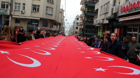 Debboy mevkisinden başlayan yürüyüşte yaklaşık 250 metre uzunluğunda dev Türk bayrağı açılırken, "Şehitler ölmez, vatan bölünmez", "Türk-Kürt kardeştir, huzuru bozan kalleştir", "Polis ve askere uzanan eller kırılsın" sloganları atıldı.