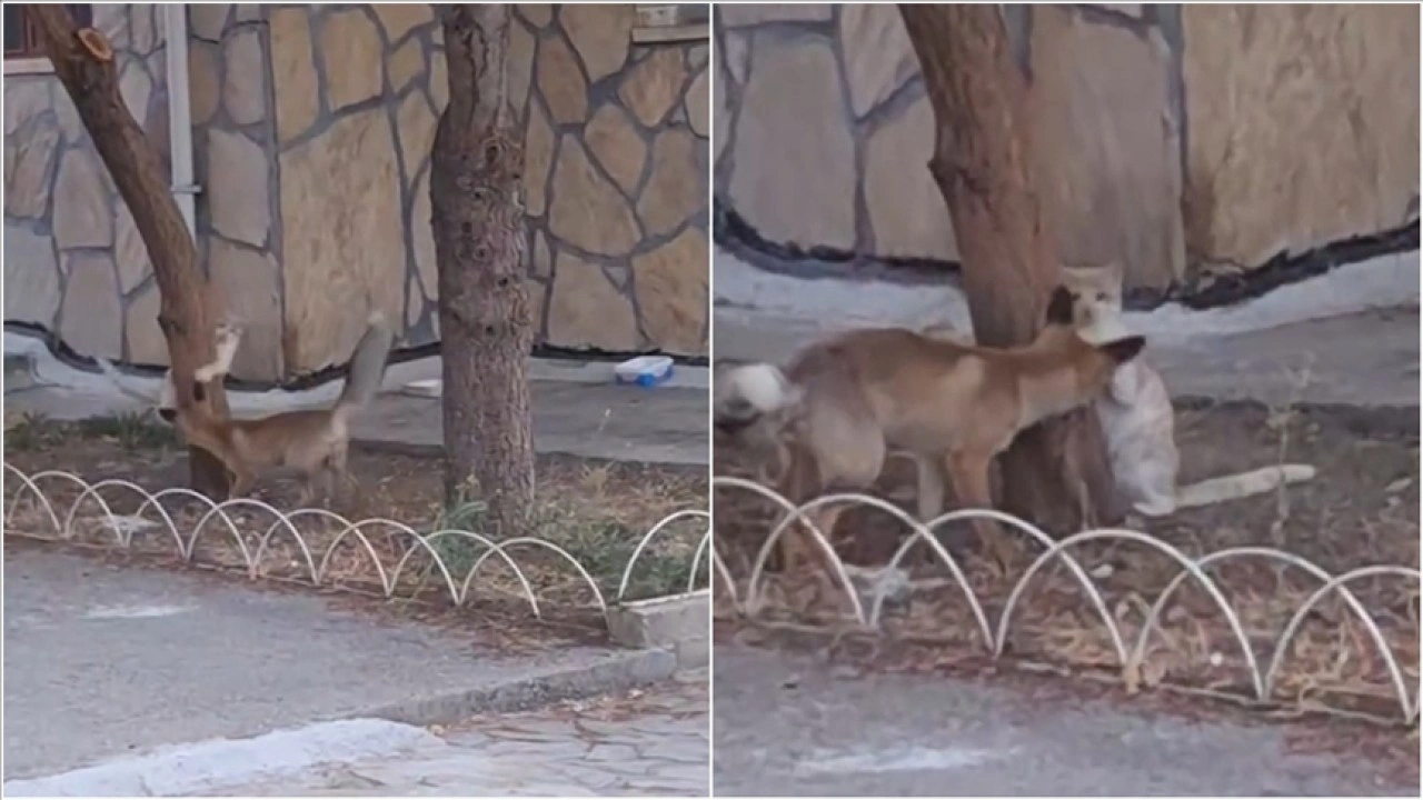 Bilecik'in Bozüyük ilçesinde tilki ile sokak kedisinin oyun oynaması, cep telefonu kamerasıyla kaydedildi.