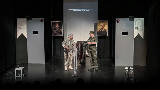 "Nevinya" ve "Sevinya" isimli hayali iki komşu ülke üzerinden savaşları eleştiren "Sınır", Frankfurt Gallus Tiyatro'da festival takipçilerinin beğenisine sunuldu.
