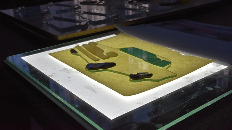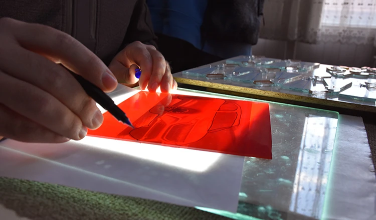 Ürünlerin her parçasını ayrı ayrı boyuyoruz. Boyanan camları el yordamıyla kesiyoruz. Kesilen parçalar, rodajlanmasının (taşlama) akabinde geçici olarak yapıştırılıyor.