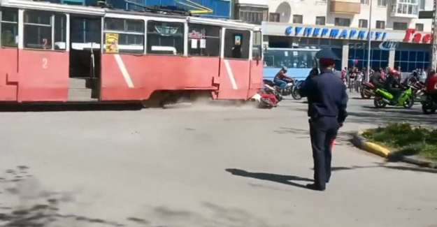 Kazakistan’da Sovyetler Birliği tarafından Nazi Almanya’sına karşı kazanılan İkinci Dünya Savaşı zaferinin 69. yıldönümü kapsamında yüzlerce motosikletlinin ülkenin Karağandı kentinde gerçekleştirdiği gösteri sırasında facianın eşiğinden dönüldü. 2014 yılında yaşanan ancak geçtiğimiz günlerde ortaya çıkan görüntülerde, motosiklet sürücüleri kornalar çalarak kentin Temirtau caddesinde gösteri yapıyor. Vatandaşların da ilgi gösterdiği gösteride, motosiklet sürücüleri hızla gelen tramvayı fark etmiyor. Kontrolü bir türlü sağlayamayan tramvay, önce kırmızı bir motosikleti ardından da diğer motosikletleri biçerek metrelerce sürüklüyor. Çevrede bulunanların ilk yardıma koştuğu olayda, şans eseri yaralanan olmadı.