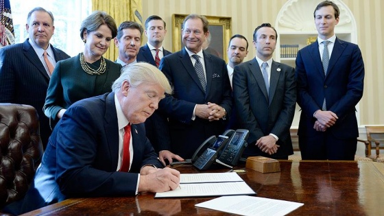 Açıklamada, Trump'ın Amerikalı şirketlerin üst düzey yöneticileri eşliğinde Oval Ofis'te imzaladığı kararnamenin, federal kurumların "Regülasyon reformu görev güçleri" oluşturmasını emrettiği belirtildi.