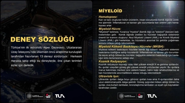 TUA'nın sosyal medya hesabından yapılan paylaşımda, uzayda kalış süresi boyunca astronotların bağışıklık sistemleri ve kan yapımı süreçleri üzerinde ultraviyole ışınları, galaktik kozmik radyasyon gibi zorlu koşulların etkilerini araştıran "MİYELOİD" deneyinin terimlerine yer verildi.