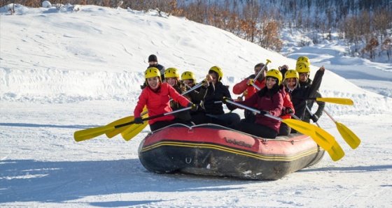 Kar motoru yardımıyla zirveye taşınan bota, gerekli güvenlik önlemleri alındıktan sonra binen 8 raftingci, bin 200 metrelik pistin zirvesinden kendilerini aşağıya salarak adrenalini üst seviyeye çıkardı. Botun hızını ve yönünü ellerindeki küreklerle ayarlayan MADOSK sporcuları, pist üzerinde rafting yaptıkları sırada yer yer kara saplanarak heyecan dolu dakikalar geçirdi.