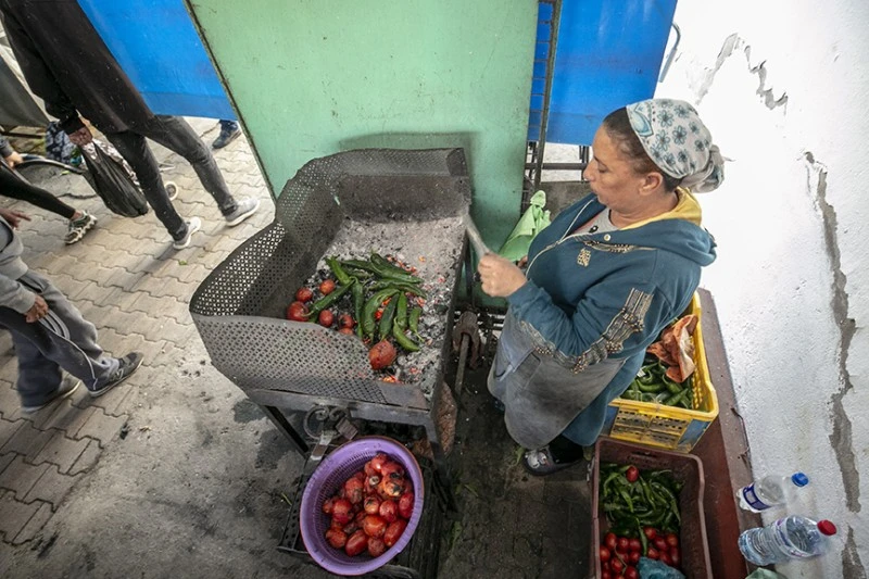 “Sebzeleri ilk başta mangalda iyice közlüyorum. Ardından küçük küçük doğradığım sebzeleri ve baharatları geleneksel yöntemlerle, karışacak şekilde bakır havanda dövüyorum.