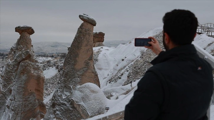 Peribacaları, kayadan oyma kiliseleri, şapel ve manastırları, doğal kaya oluşumlarıyla kaplı vadileri ile yılın her mevsimi konuklarına farklı manzara sunan Kapadokya'da kar yağışı sabah saatlerinden itibaren aralıklarla etkisini gösterdi.