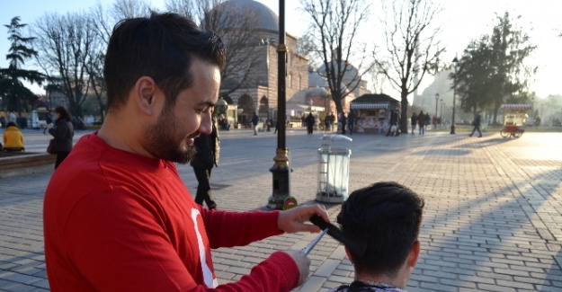 Dünyanın çeşitli meydanlarında saç tıraşı yapan üniversite diplomasına sahip berber Kadir Alkan’ın Sultanahmet meydanında yaptığı saç tıraşını yabancı turistler şaşkın bakışlarla izledi. Berber Alkan’ın, en büyük hayali tüm dünya meydanlarında saç tıraşı yapmak.