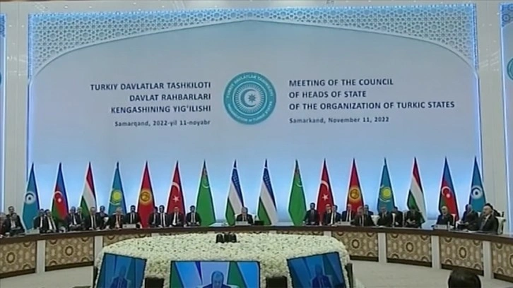 Özbekistan Cumhurbaşkanı Şevket Mirziyoyev'in ev sahipliğinde "Türk Medeniyeti için Yeni Dönem: Ortak Kalkınma ve Refaha Doğru" temasıyla Semerkant'ta düzenlenen Türk Devletleri Teşkilatı (TDT) Devlet Başkanları 9'uncu Zirvesi öncesinde liderler aile fotoğrafı için bir araya geldi.