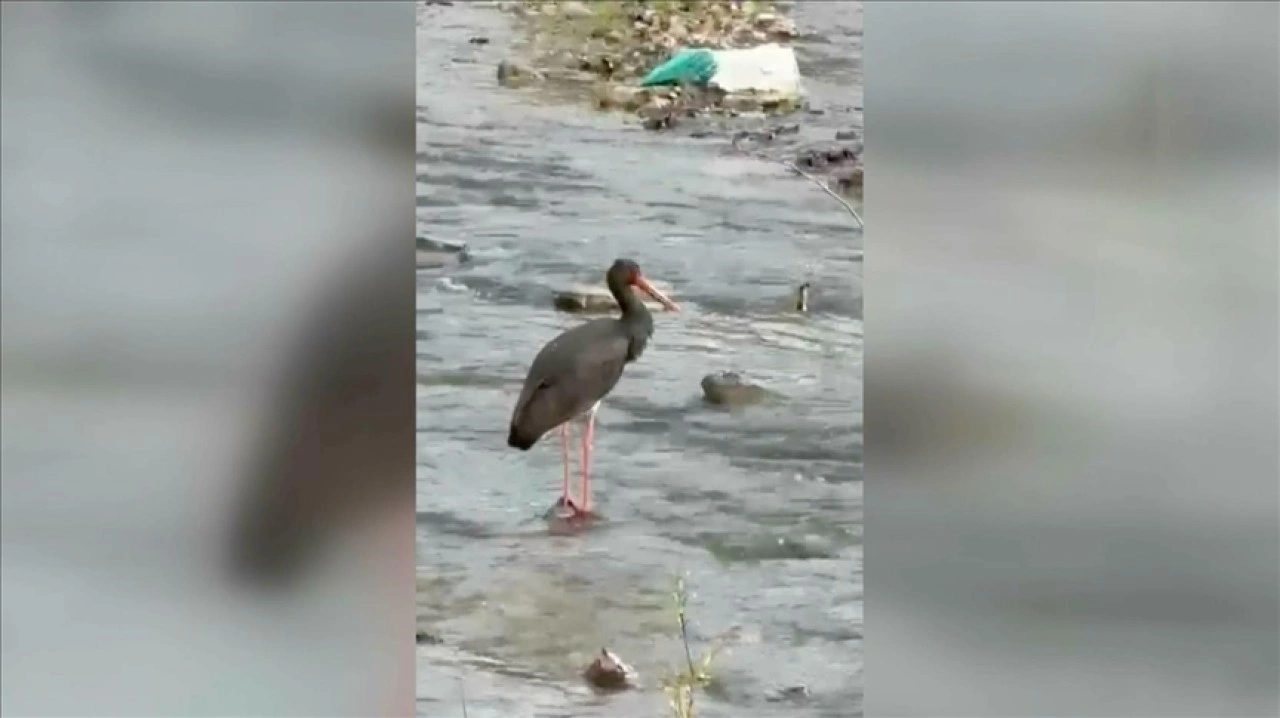Görüntüde Türkiye'de nadir görülen türlerden kara leylek olduğu belirlenen kuşun çayın içerisinde beklemesi, ardından uçarak gözden kaybolması yer alıyor.