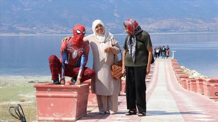 Kuruma tehdidi altındaki Burdur Gölü'nün kıyısına giden "Örümcek Adam", sular çekildikten sonra karada kalan iskelede fotoğraf çektirdi, iskelenin altından ve üstünden geçerek ziyaretçilere gösteri sundu. Yüzey alanının yaklaşık yarısını kaybeden Burdur Gölü'ne üzüldüğünü dile getiren Koç, "göl kurumasın" diye seslendi.