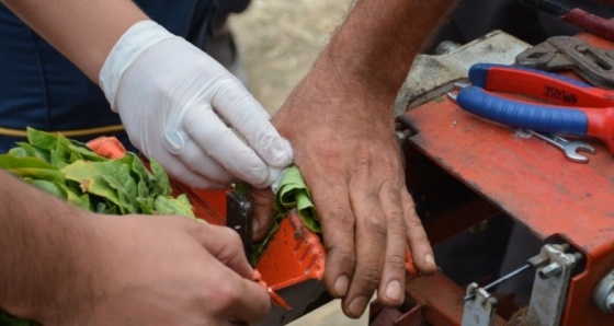 36 yaşındaki Mehmet Kök, tütün toplamak için ailesiyle birlikte Akça köyündeki tarlasına gitti. Tarlada çalıştıkları sırada otomatik tütün dizimi yapan makinenin çelik iğneleri Kök’ün eline saplandı.