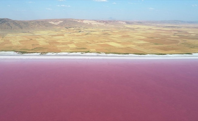 Kışın buz mavisi, yazın beyaz rengiyle dikkati çeken Tuz Gölü'nde, bugünlerde bir alg türü olan "dunaliella salina"lar nedeniyle adeta kırmızı beyaz şölen yaşanıyor.