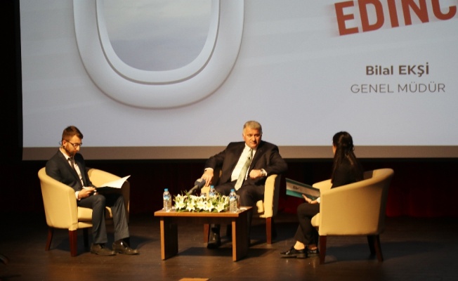 İstanbul’daki yeni havalimanının iki pist ve 5 tane paralel, bir tanede doğu-batı ekseninde olan pisti olduğunu hatırlatan Ekşi, "Saatte 74 uçak iniş-kalkış kapasitesinden 200 iniş-kalkış kapasitesine ulaşacak bir havalimanından bahsediyoruz. Havalimanının bu kadar büyük yapılmasının amacı İstanbul’un son derece değerli olan aktarma kabiliyetini taçlandırmak içindir. Bu proje ile birlikte inşallah İstanbul, Avrupa, Asya ve Afrika’nın ana aktarma merkezlerinden bir tanesi haline gelecek. İstanbul Havalimanı ile sadece Türk Hava Yolları değil Türk Sivil Havacılığı da şaha kalkacaktır. 6 Nisan tarihinden itibaren bütün seferlerimiz oradan yapılmaya başlanacaktır. Türkiye hem tarihi geçmişiyle hem insanının DNA’sında bulunan misafirperverliğiyle hem de iş yapabilme gücüne sahip Türk müteşebbis ve çalışanı ile havacılıkta inşallah bugün geldiği rekorları da kırarak çok daha büyük yerlere gelecektir." şeklinde konuştu.