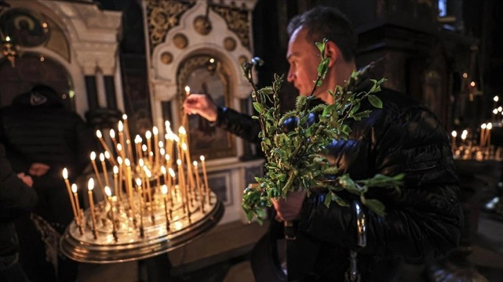 Nüfusun çoğu Ortodoks olan başkent Kiev'in merkezindeki Volodimir Katedrali'nde düzenlenen ayine katılanlar, ellerinde şimşir ağacı dalları tuttu.