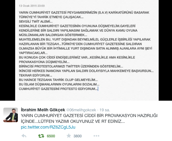 Dün geceki mesajı ile "gayesi kendilerine bir saldırı yapılmasını sağlamak" diyen, Ankara Büyükşehir Belediye Başkanı Melih Gökçek ise Cumhuriyet'in provokasyonuna gelinmemesi ve herkesin mahkemeye başvurması yönünde çağrıda bulunmuştu.