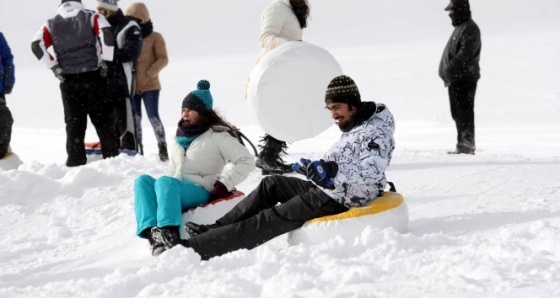 Uludağ'da bir günlük tek kişi tatilin bedeli yaklaşık bin liraya kadar çıkınca dar gelirli günübirlikçi vatandaşlar poşetle kayarak karın keyfini çıkardı.