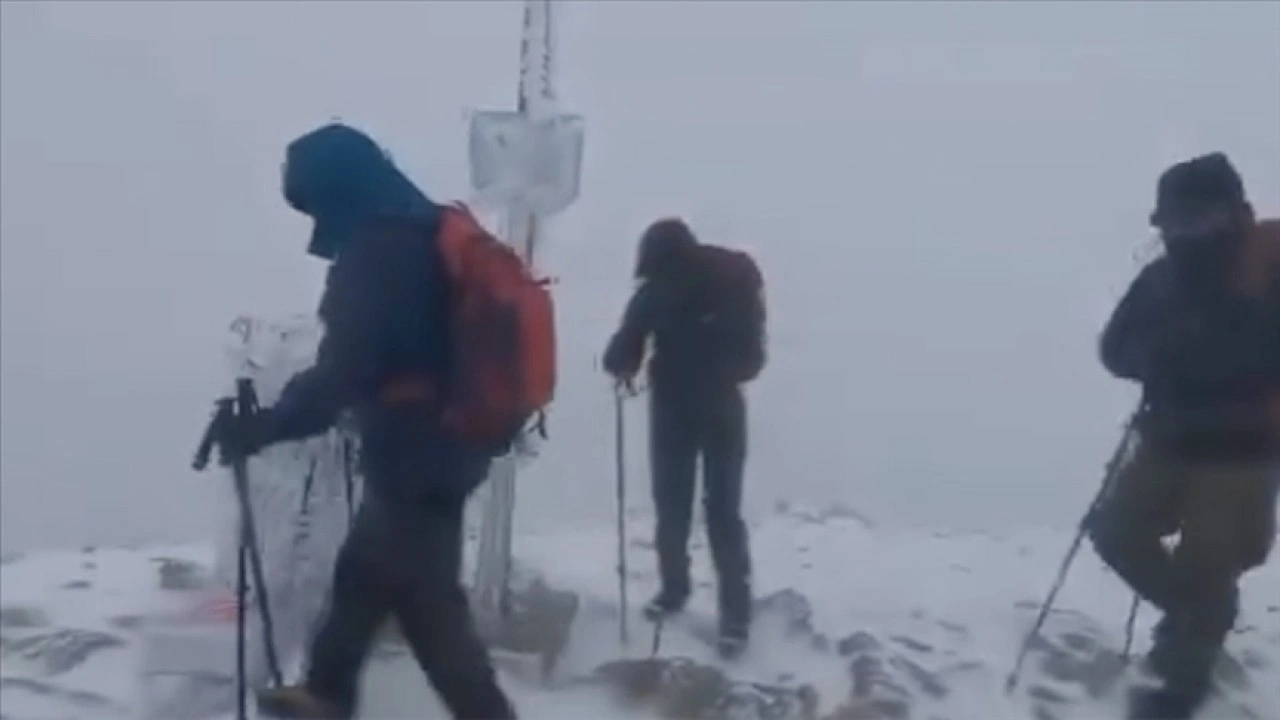 Yağış nedeniyle Uludağ'ın zirvesi kısmen beyaz örtüyle kaplandı. Bir grup dağcı da tipi ve yağışın etkili olduğu havada zirveye tırmandı.