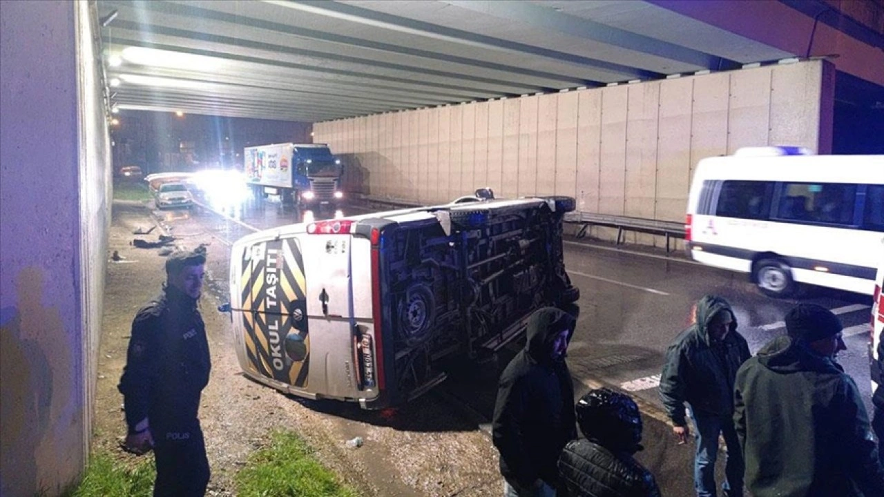 Şile Yolu Tepeüstü kavşağında 34 LGH 107 plakalı servis minibüsü, yağışın etkili olduğu yolda kontrolden çıkarak devrildi.
