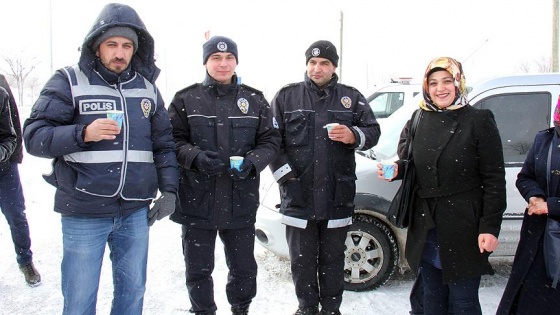 Yozgat’ta Kredi Yurtlar Kurumu (KYK) yurtlarında kalan bir grup üniversite öğrencisi, soğuk havada uygulama yapan polislere sıcak çorba ve yemek ikramında bulundu.