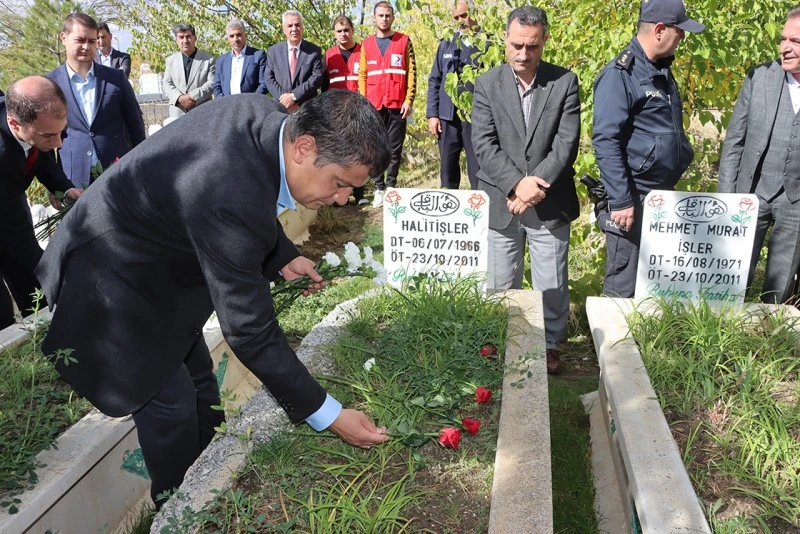 Depremde hayatını kaybedenler için dua eden Mehmetbeyoğlu ve beraberindekiler, mezarlara karanfil bıraktı.