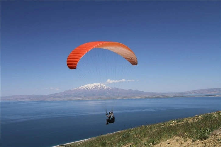 Farklı illerden gelen paraşütçüler, Süphan Dağı ve Van Gölü manzarası eşliğinde uçuş yaptı.