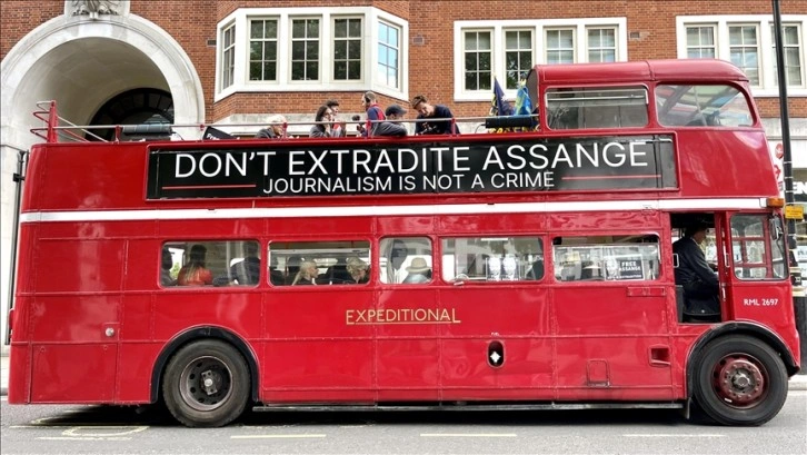 Başkentin simgeleri arasında yer alan eski bir kırmızı otobüse "Assange'a özgürlük", "Gazetecilik suç değildir" ve "Assange'ı iade etmeyin" yazılı pankartlar asıldı.