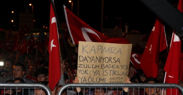 Demokrasi nöbetinde "Kapımıza dayanıyorsa zulüm, başka yok yok: Ya istiklal ya ölüm" yazılı pankart dikkat çekti.