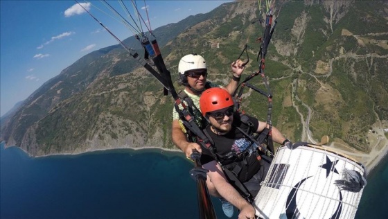Tekirdağ'ın Şarköy ilçesine gezmeye gelen Ahmet Çelik, yamaç paraşütüyle uçarken davul çaldı.