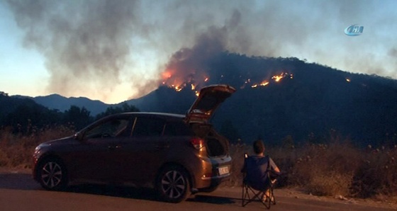 İtfaiye ekiplerinin yangına müdahale ettiği sırada bir vatandaş, yanında getirdiği sandalyeye oturarak yangını saniye saniye izledi.
