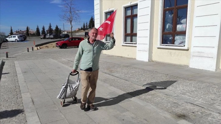 Akgün, köyünden bir çuval kömür yüklenerek minibüsle geldiği Edirne'de yardımını Atatürk Kültür Merkezine elindeki Türk bayrağıyla getirdi.