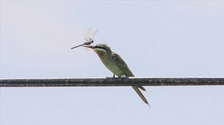 Görüntülerde yeşil arı kuşunun yakaladığı yusufçuk böceğini gagasında tutması, üzerinde durduğu telefon kablosuna vurarak öldürmesi ve yutması görülüyor.