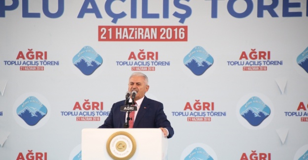 Toplu açılış töreninde Ağrı’nın kendisi için ilk göz ağrısı olduğunu ve dedelerinin Ağrı’nın Eleşkirt ilçesi Tahir beldesinde yaşadığını belirten Başbakan Yıldırım, “Türkiye’yi bölmeye çalışanlar, bizi birbirimize düşürmeye çalışanlar, bunlar yerli değil, bunlar başkalarının, üst akıllarının akıllarıyla hareket ediyorlar. Asla ve asla sizin geleceğinizi, sizin çocuklarınızın geleceğini bunlar düşünmüyor, bunlar efendileri ne derse onu yapıyorlar. Bunlar sadece ayrıştırmayı, öldürmeyi, insanların arasına ayrılık tohumları ekmeyi bilirler ama Allah’a şükür Ağrı, bu oyunlara gelmedi, elinin tersiyle terörün bu oyunlarını itti. İnadına ’kardeşlik’ dediniz, inadına ’birlik’ dediniz, inadına ’beraberlik’ dediniz. Siz terör örgütüne yüz vermediniz, hendeklere izin vermediniz, onlar ’Böleceğiz’ dedi, siz ’tek Türkiye’ dediniz. Onun için sizlere teşekkür ediyorum" şeklinde konuştu.