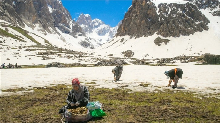 Büyük bölümü karla kaplı Cennet Cehennem Vadisi'ndeki 3 bin 400 rakamlı yaylaya giden kent merkezi ve Yüksekova ilçesindeki kadınlar, kar örtüsünün altında yörede en çok tüketilen otları topluyor.