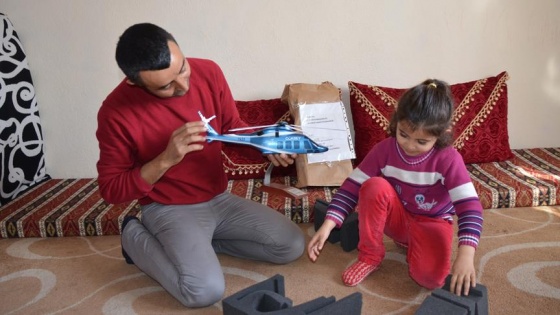 Kargoyla gönderilen paketi teslim alan Karahan, çıkan parçaları çocuğuyla birleştirdi.
