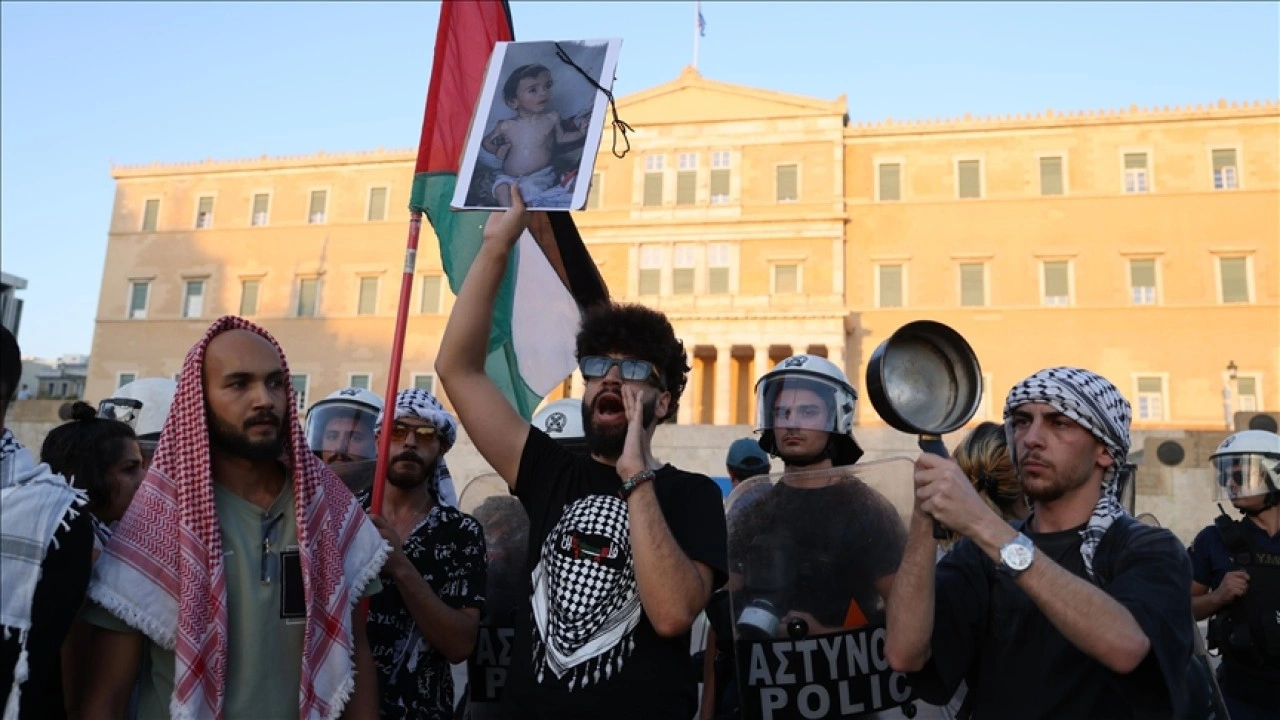 Filistin halkına destek vermek isteyen eylemciler, Atina'nın merkezindeki Sintagma Meydanı'nda bulunan parlamento binası önünde toplandı.