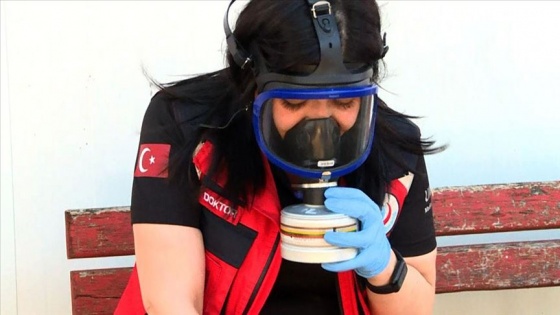 Sağlık çalışanları sahra çadırında gaz maskesi takarak çalışmalarını sürdürüyor.