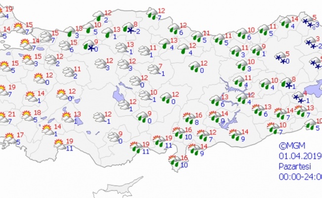 Yurdun geneli parçalı ve çok bulutlu; Doğu Akdeniz, İç Anadolu’nun güney ve doğusu, Doğu Karadeniz, Doğu ve Güneydoğu Anadolu ile Ordu ve Tokat çevrelerinin yağışlı geçeceği tahmin ediliyor. Yağışların; Batman, Bitlis, Siirt ve Şırnak çevrelerinde kuvvetli olmak üzere genellikle yağmur ve sağanak, Doğu Akdeniz ile Güneydoğu Anadolu’da yer yer gök gürültülü sağanak, İç Anadolu’nun kuzeydoğusu, Doğu Karadeniz’in iç kesimleri ile Doğu Anadolu’nun kuzey ve doğusunda karla karışık yağmur ve kar şeklinde olması bekleniyor.
