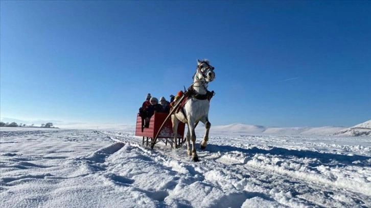 Gölün, Ardahan tarafındaki kıyı kesimlerine gelen yerli ve yabancı turistler, buzla kaplı göl üzerinde yürüyüş yapıp, atlı kızaklarla gezinti yapıyor.