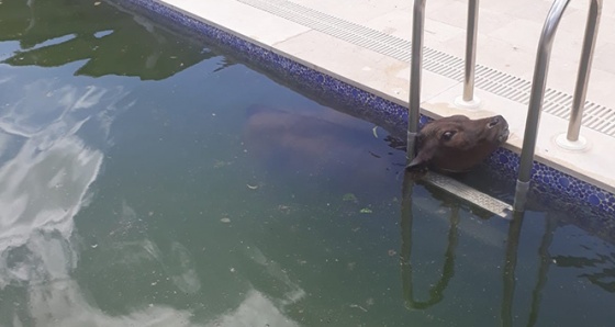 Gümüşlük Mahallesi Salkım Sokak'ta bulunan lüks bir sitenin yüzme havuzuna düşen buzağı, site sakinlerini şok etti. İçi su dolu yüzme havuzunun merdivenlerine de kafası sıkışan buzağıyı site sakinleri kurtarmak için seferber oldu. Buzağıyı havuzdan bir türlü çıkaramayan site sakinleri, durumu itfaiye ekiplerine haber verdi. Havuzun başına gelen ekipler önce buzağının kafasını havuz merdiveninden kurtardı. Boğulma tehlikesi geçiren buzağı daha sonra halat vasıtasıyla havuzdan çıkarıldı.